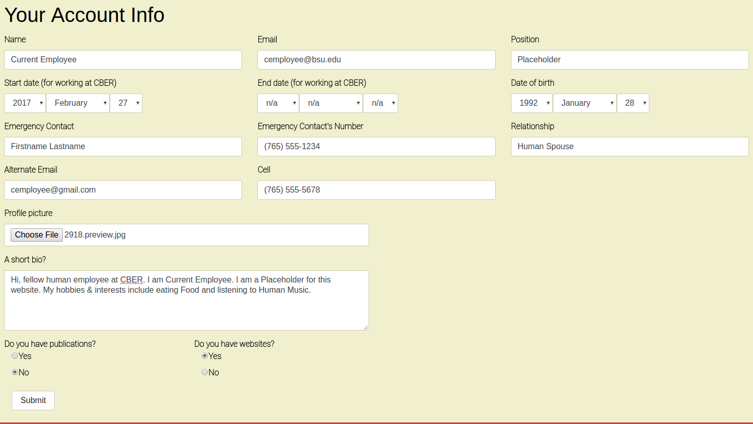 Please fill out your account information after your account has been created. You can do this by clicking Edit Your Account at the top of the screen. You may add as much or as little information as you wish, including any degrees or awards you've earned in your academic career. It is most helpful if you provide as much information about yourself as possible! We collect this information so that we can use the site for a variety of purposes: providing job references for new or soon-to-be grads, writing bios for events or other websites, and just getting to know each other.